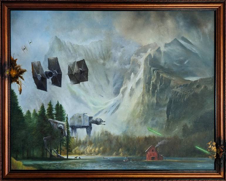 The evil empire is overtaking a serene peaceful location in Estes Park, Colorado. Background inspired by Albert Bierstadt. Frame is also sculpted and carved to extend explosions from painted subjects. Oil on canvas Ornate wood frame